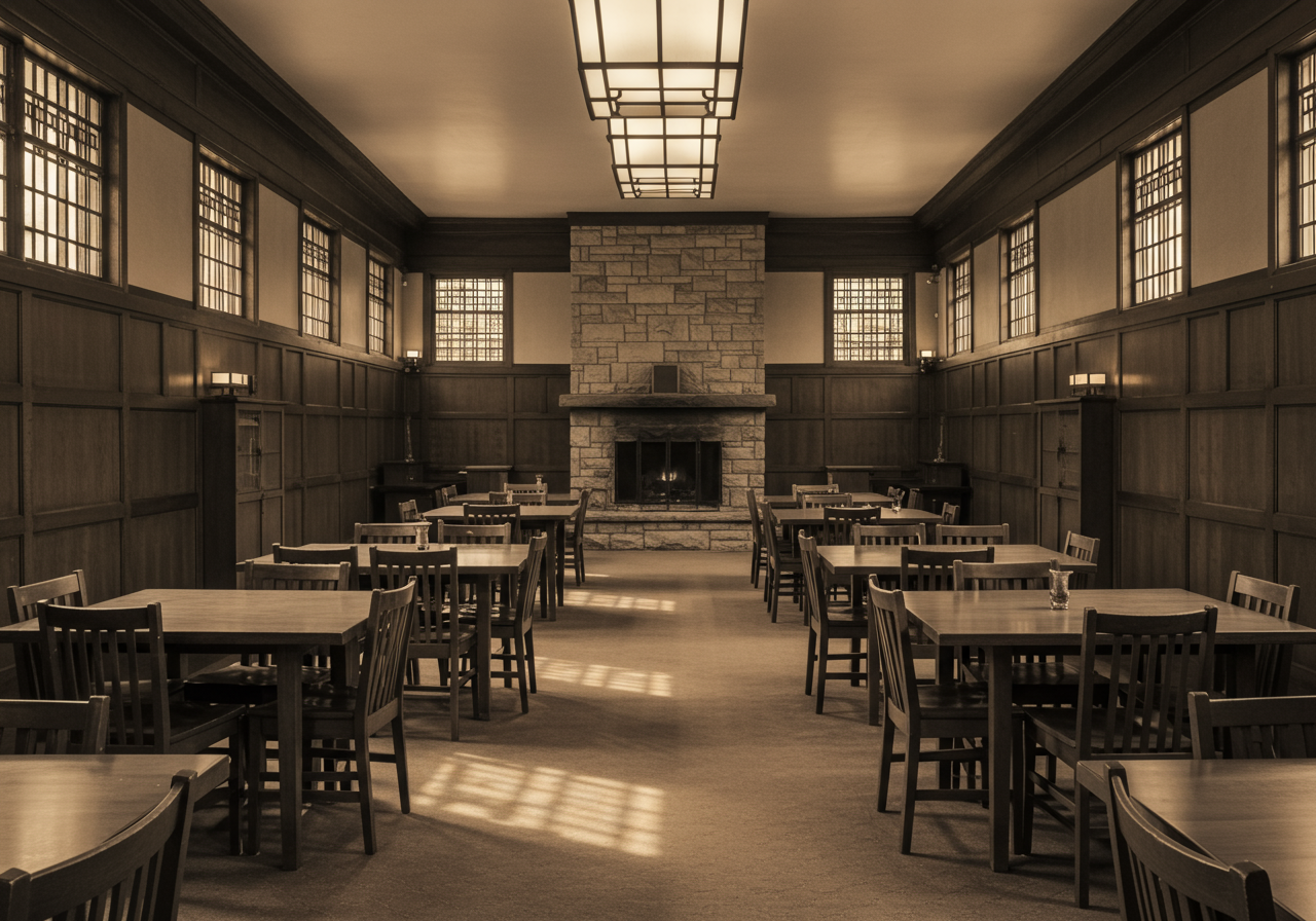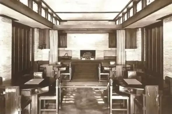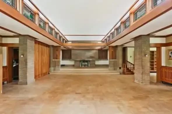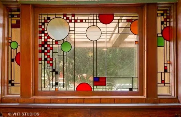 This structure served as a testing ground for some concepts Wright would later use in his Usonia homes such as flat, cantilevered roofs and lots of built-in shelving. Perhaps most striking are the recognizable Wright design elements like detailed interior woodwork and decorative art glass windows that this famous architect was known for.
